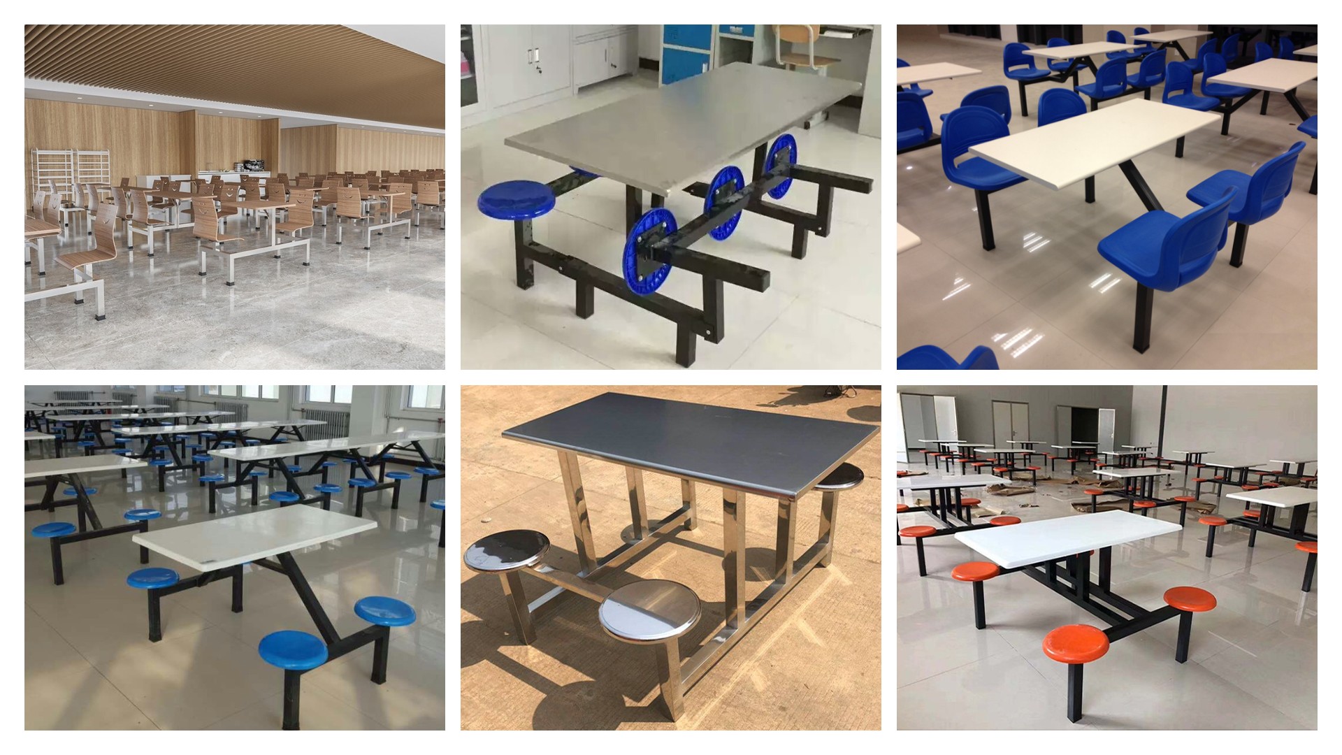 食堂餐桌用材比較廣泛,多以桌面與座椅相連接的款式為主。高度以720mm-760mm為標準,餐桌椅是人類日常生活和社會活動中使用的具有坐臥、憑倚、餐食等功能的器具。通常由若干個零、部件按一定接合方式裝配而成。給大家用餐時使用的桌椅,鋼木結構居多,結構簡單,顏色簡潔。